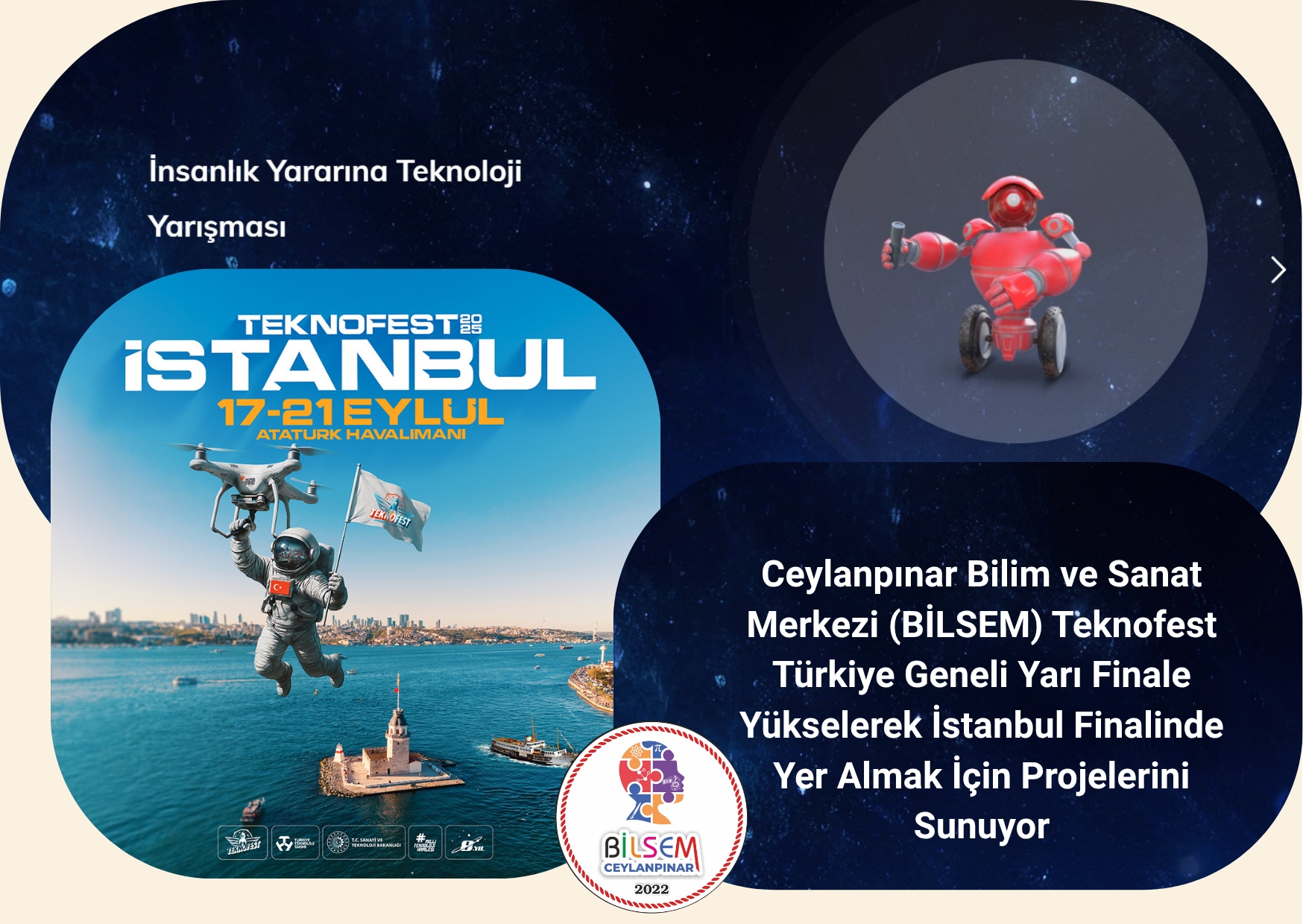 İlçemiz Ceylanpınar Bilim ve Sanat Merkezi öğretmen ve öğrencilerinden bir proje ekibi oluşturarak projelerini geliştirip TEKNOFEST yarışmalarına katılmıştır. "İnsanlık Yararına Teknoloji Yarışması Afet Yönetimi" kategorisindeki projeleriyle yarı finale kadar yükselmişlerdir. Yarı finalde projedeki başarılarını sürdürerek Büyük Teknofest İstanbul finallerinde olmayı hedeflemektedirler. Başarılarını tebrik ediyor, çalışmalarındaki bu başarılarının devamını diliyoruz.